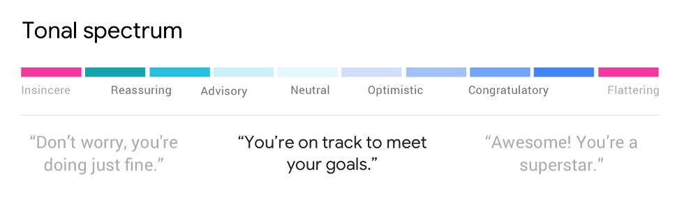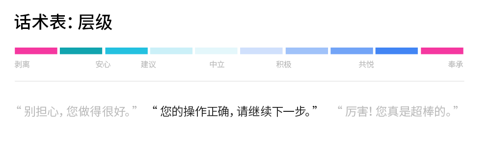△ 話術表是文案手邊的有力工具,用來拿捏不同場合下的行文風格。當然,這種分級的設計方式也可以用在話術之外的地方,比如視覺設計、交互設計等領域。(上圖為了便於精確理解使用了雙語,請大家理解中英文間的細微變化。這種理解也是本地化工作的基礎之一)