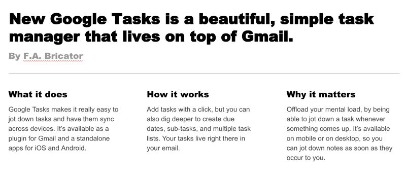 △ 使用新聞稿的模式來描述產品,會迫使您使用更精煉、更非技術化的語言來進行表達。將 「這是什麼」、「為什麼這麼做」 以及 「如何這麼做」 的核心信息傳達給更廣泛的受眾。
